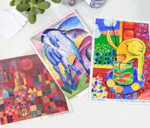 01 quebra-cabeça “Cavalo azul” de Franz Marc, tamanho 20x30cm com 60 peças;