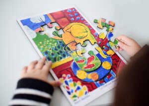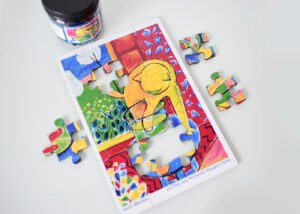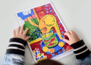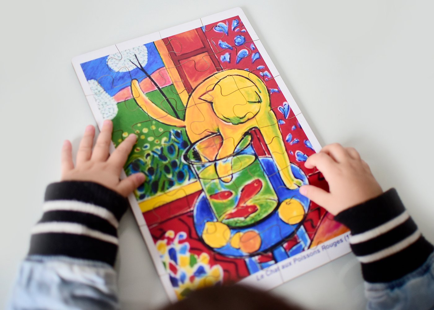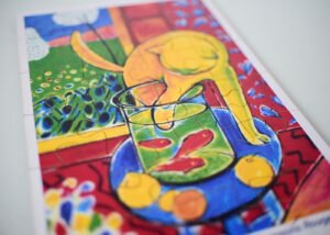 Descubra a arte de Henri Matisse com este encantador quebra-cabeça de 24 peças, apresentando a obra ‘Le Chat aux Poissons Rouges’ (ou, Gato com Peixes vermelhos de 1914).