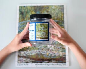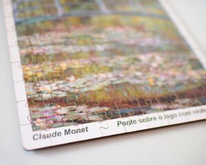 Explore a beleza atemporal da arte impressionista das obras de Monet, com este quebra-cabeça de 120 peças retratando a famosa obra ‘Ponte sobre o lago com ninféias”, ou “Ponte sobre o lago com nenúfares”.