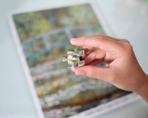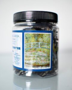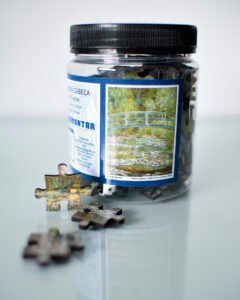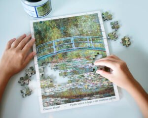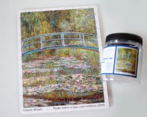 Explore a beleza atemporal da arte impressionista das obras de Monet, com este quebra-cabeça de 120 peças retratando a famosa obra ‘Ponte sobre o lago com ninféias”, ou “Ponte sobre o lago com nenúfares”.